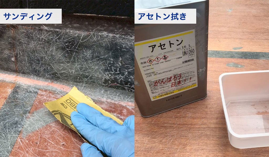 防水層が乾燥したら、表面のサンディング(目荒らし)と、アセトン拭きを行います。