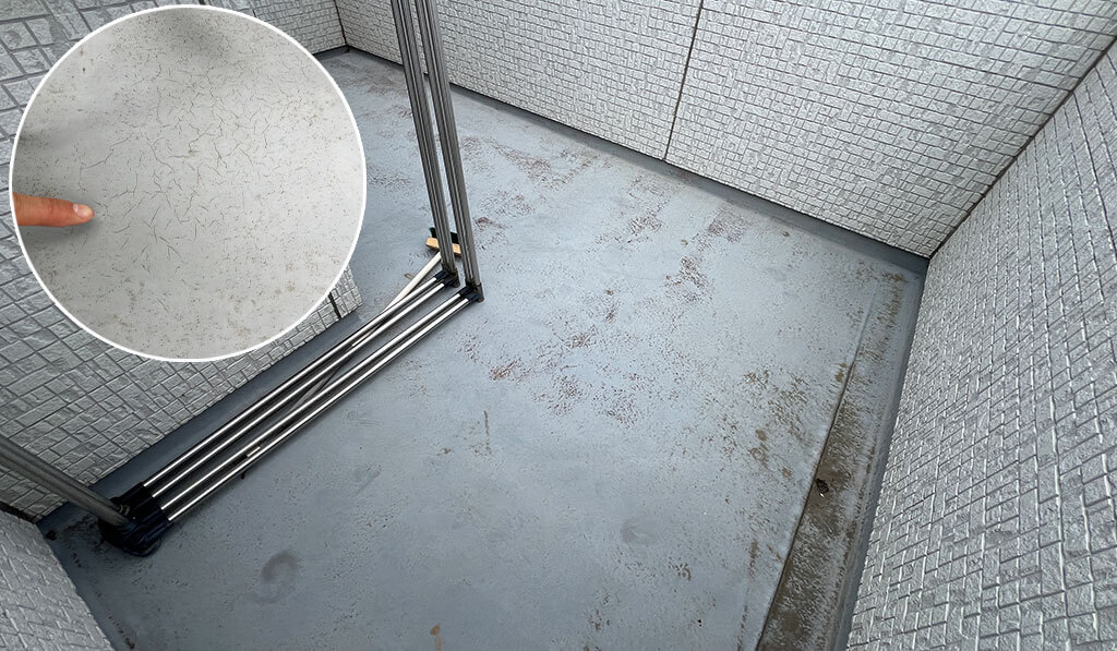 【東京都江東区】劣化の初期段階にベランダと屋上バルコニーを同時メンテナンス!ベランダ防水工事と軒天洗浄をしました。目次1. リフォームしようと思ったきっかけ2. 工事情報2.1. ビフォーアフター写真①2.2. ビフォーアフター写真②2.3. 工事見積3. 工事の工程写真3.1. 工事前のベランダ3.2. 防水工事中3.3. 工事終了3.4. 軒天洗浄も行いました リフォームしようと思ったきっかけベランダの床表面に、細かいひび割れが出てきたのが気になっています。場所はベランダ2箇所と、屋上のバルコニーです。メンテナンスが必要なのか、何をしたらいいのか分からないため一度見に来てほしいです、とご依頼をいただきました。工事情報工事日2025年6月工事場所東京都江東区築年数築12年工事内容ベランダ防水工事施工箇所ベランダ(2階・3階)屋上バルコニー使用防水塗料高耐久ウレタン塗料工事日数3日工事金額374,000円ビフォーアフター写真①beforeafterビフォーアフター写真②beforeafter工事見積工事項目面積/長さ金額(税抜)清掃・養生工一式13,000円室外機昇降2台10,000円下地補修一式35,000円アセトン拭き一式10,000円プライマー25㎡37,000円防水施工25㎡220,000円産業廃棄物1台15,000円諸経費10%37,400円合計金額(税抜)374,000円工事の工程写真工事前のベランダ今回の工事は、ベランダ2箇所と屋上のバルコニー、合わせて3箇所行います。表面の細かいひび割れが気になるとのことで、ご依頼をいただきました。このように表面に見える細かいひび割れは、ベランダ防水のメンテナンスの時期の目安です。放置すると、ひび割れが深くなって雨漏りに繋がる危険性があるため、早めにメンテナンスをしましょう。防水工事中清掃や下地処理などをしっかりと行い、防水塗料を塗布します。完全に乾燥したら、重ね塗りをします。工事終了以上で、ベランダ防水工事は終了です。軒天洗浄も行いました現地調査で伺った際、お客様から「軒天の汚れが気になっていて・・・」というお悩みをお聞きしました。軒天の黒ずみの原因は、湿気によるカビや苔・塗膜の劣化などです。そこで、軒天洗浄も同時に行うことになりました。今回はサービスで、通常22,000円の軒天洗浄を0円で行いました。「ずっと気になっていた汚れが綺麗になった!」とお客様も大変喜ばれておりました。 合わせて読みたい 【東京都世田谷区】ベランダの床面に小さなひび割れ発生!20年対候性塗料を使用して、ベランダ防水工事を行いました。 【千葉県浦安市】築32年バルコニーの下に雨染み発生・・・!新しいFRP防水を重ねて安心の暮らしを。ベランダ防水工事をしました! 【東京都杉並区】目に見えない下地補修は防水層長持ちの秘訣!築15年の住宅のベランダ防水工事(トップコート塗り替え)を行いました。 【神奈川県川崎市宮前区】経年劣化による亀裂や膨れが気になる屋上防水。細かい部分も丁寧な施工で長持ちする防水層へ!屋上防水工事をしました。 2025年12月15日2026年1月9日施工事例,防水工事東京都